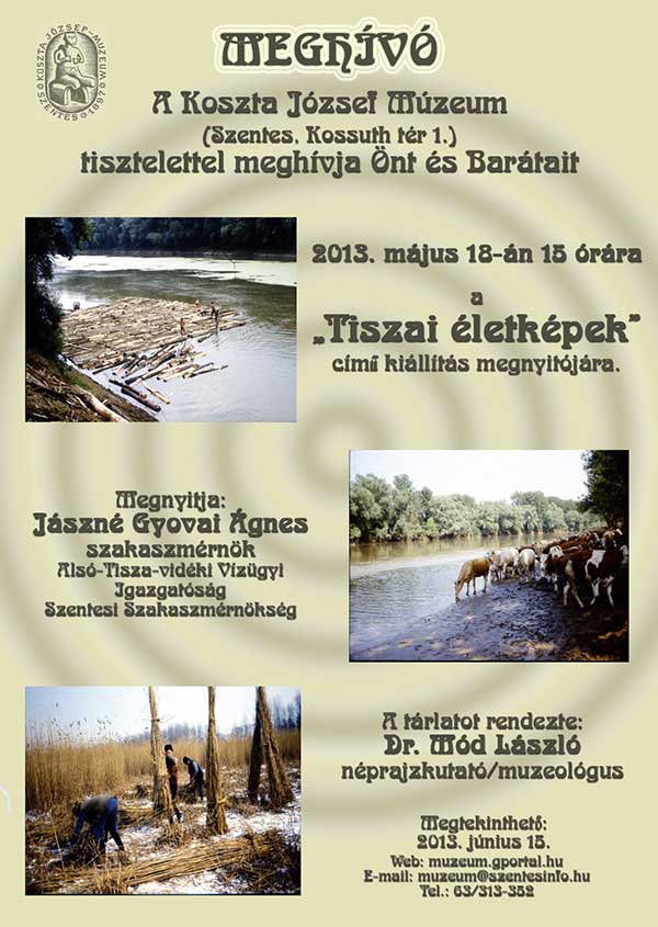 Tiszai életképek címmel nyílik kiállítás a Koszta József Múzeumban 2013. május 18-án 15.00 órai kezdettel. A kiállítást megnyitja Jászné Gyovai Ágnes az Alsó-Tisza-vidéki Vízügyi Igazgatóság Szentesi Szakaszmérnökségnek szakaszmérnöke. A tárlatot rendezte: Mód László néprajzkutató/muzeológus.