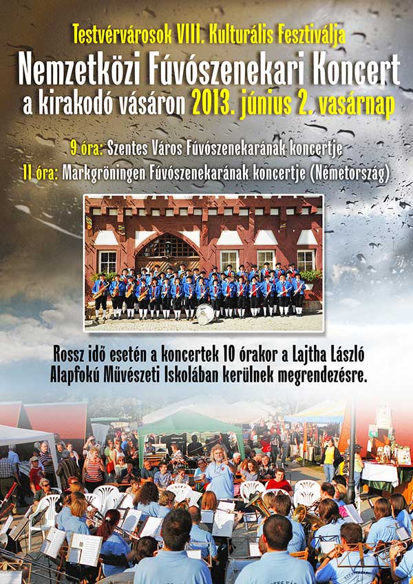 2013. június 2-án rossz idő esetén a Testvérvárosok VIII. Kulturális Fesztiválja keretén belül megrendezendő Nemzetközi Fúvószenekari Koncert a Lajtha László Alapfokú Művészeti Iskolában kerül megrendezésre!