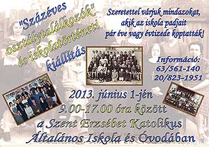 2013. június 1-jén 9-17 óra között a Szent Erzsébet Katolikus Általános Iskola "Százéves osztálytalálkozóra" és iskola történeti kiállításra hívja, várja mindazokat, akik akár pár éve vagy netán évtizede koptatták az iskola padjait.