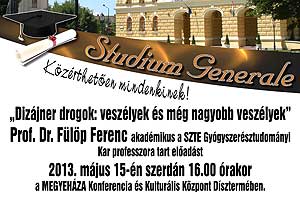 2013. május 15-én a Studium Generale programban "Közérthetően mindenkinek!" szólt a „Dizájner drogok: veszélyek és még nagyobb veszélyek” című előadás a MEGYEHÁZA Konferencia és Kulturális Központ Dísztermében melyet Prof. Dr. Fülöp Ferenc akadémikus a SZTE Gyógyszerésztudományi Kar professzora tartott. A dizájner drogok fél év alatt olyan mértékű leépülést hoznak, mint a régiek tíz év alatt!