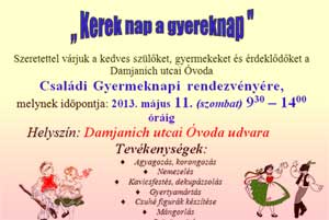 Szeretettel várjuk a kedves szülőket, gyermekeket és érdeklődőket a Damjanich utcai Óvoda Családi Gyermeknapi rendezvényére, melynek időpontja: 2013. május 11. (szombat) 9.30 – 14.00 óráig. Helyszín: Damjanich utcai Óvoda udvara. Katt a képre! Szentes, 2013. 05. 08.
