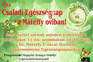 Újra Családi Egészségnapot rendeznek a Mátéffy oviban 2013. május 11-én, szombaton 14.00 - 18.00 óra között. Játékos sorversenyek, arcfestés, légvár, kalandpark stb. várja a résztvevőket.