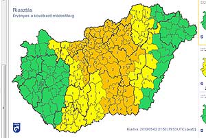 A legmagasabb veszélyességi fokozatú, 2. (NARANCS) riasztást adott ki Szentes és környékére is az Országos Meteorológiai Szolgálat Repülésmeteorológiai és Veszélyjelző Osztálya. Péntek éjfélig eleinte a Dunántúl középső és keleti részén, majd késő este ill. éjjel már másutt is kialakul zivatar. Péntek napközben és este nagyobb eséllyel az ország keleti, délkeleti felében lehet dörgés, villámlás. Néhol heves zivatar is valószínű (főként a Dunántúl keleti felén, a Duna-Tisza közén, de másutt sem zárható ki), amelyet 90 km/h fölötti szélroham és/vagy nagyobb méretű (> 2 cm) jég kísérhet. Helyenként rövid idő alatt nagy mennyiségű csapadék hullhat (20-40, kis eséllyel > 40 mm).