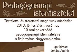Tisztelt Pedagógusok! Tisztelettel és szeretettel meghívunk minden pályán lévő és nyugdíjas pedagógust a 2013. június 2-án, vasárnap 10 órakor a szentesi Református Nagytemplomban tartandó PEDAGÓGUS NAPI ISTENTISZTELETRE, s az ezt követő szeretetvendégségre (iskola 4-es tanterme). Igét hirdet: Juhász András, a Szeged-Kálvin téri Református Egyházközség lelkipásztora, a Csongrádi Református Egyházmegye főjegyzője Az istentisztelet után kerül sor id. Juhász András fafaragóművész kiállításának megnyitására a Nagytemplomban.