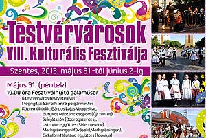 Szentesen idén hagyományosan május 31-tól június 2-ig kerül megrendezésre a Testvérvárosok VIII. Kulturális Fesztiválja. A városba a német, román és vajdasági testvérvárosokból érkeznek művészeti csoportok. A fesztivál ünnepélyes megnyitására május 31-én kerül sor 19.00 órai kezdettel a Megyeháza Konferencia és Kulturális Központban.