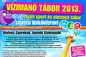Kedves Gyerekek, leendő Vízimanók! Szeretettel várunk benneteket a június 17-től induló egy hetes napközis táborainkba! Igazi tábori hangulat a strand árnyas fái alatt kialakított sátras bázison. Töltsük együtt a nyarat a szentesi strandon, ahol bármikor csobbanhatsz vagy vízi-csúszdázhatsz! Akkor is jelentkezz hozzánk, hogyha már nagynak érzed magad, elmúltál 5 éves de még nem töltötted be a 14. életévedet! Hiszen nálunk buli a nyár! Vízimanó tábor 2013. június 17-től indul heti turnusokban és augusztus 31-ig , hétfőtől péntekig reggel 8.00-16.00-ig . A tábor tartalmazza a felsorolt programokat, a tábor területén minden foglalkozást és játékot valamint a strandfürdő használatát is.