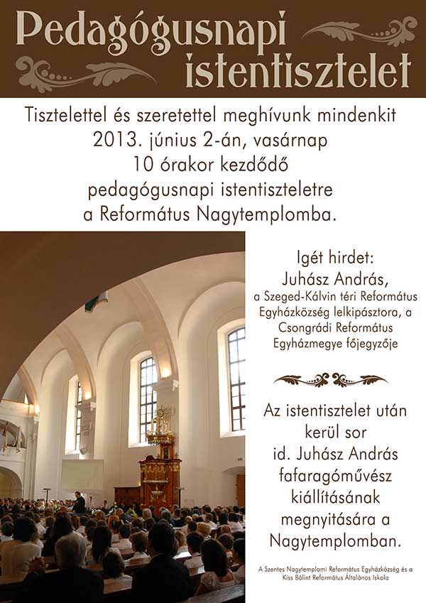 Tisztelt Pedagógusok! Tisztelettel és szeretettel meghívunk minden pályán lévő és nyugdíjas pedagógust a 2013. június 2-án, vasárnap 10 órakor a szentesi Református Nagytemplomban tartandó PEDAGÓGUS NAPI ISTENTISZTELETRE, s az ezt követő szeretetvendégségre (iskola 4-es tanterme). Igét hirdet: Juhász András, a Szeged-Kálvin téri Református Egyházközség lelkipásztora, a Csongrádi Református Egyházmegye főjegyzője Az istentisztelet után kerül sor id. Juhász András fafaragóművész kiállításának megnyitására a Nagytemplomban.