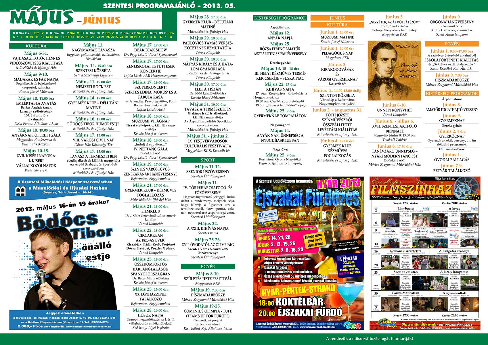 A hétvégén jelent meg a Szentesi Programajánló 2013. áprilisi száma, mely a következő egy hónap időtartam programjait, rendezvényeit hivatott népszerűsíteni. Az összeállításban részletesen megtalálhatjuk a helyi zenei, színházi, sport és egyéb szórakoztató rendezvényeit és azok helyszínét és időpontját. A Programajánlót ebben a hónapban NE keresse a FÓR magazinban, mert nem az aktuális műsor jelent meg!