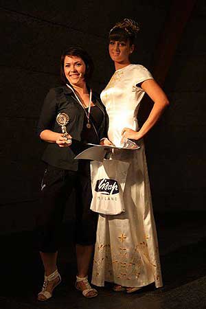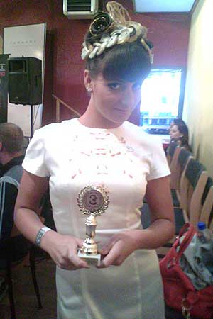 Ági, gratulálunk neked is a sikerhez, melyet a szakmai zsűri harmadik helyezéssel jutalmazott. - Örömmel segítettem Anikónak a smink elkészítésében amelyet a ruha,és a hajköltemény kialakult összképe alapján készítettem el. Fontos volt hogy harmonizáljanak a színek,ezért ezt a két szempontot,illetve a modell szemszínét és arcbőrét figyelembe véve,egy finom,visszafogott,mégis báli hatású sminket festettem. Büszke vagyok arra,hogy részese lehettem ennek a nagyszabású versenynek,és Anikónak köszönhetően sikert aratva ismét képviselhettük Szentest ezen szakma nagyjai között!