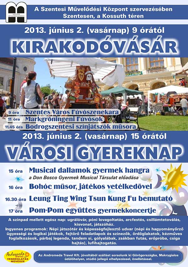 Minden év júniusának első hétvégéjén rendezik Szentesen a Népi kirakodóvásárt. Rossz idő esetén sem marad el a rendezvény, csak akkor átnevezik azt Vízi kirakodóvásárra. :-) Aki viszont a délutáni programra készül annak jó tudnia, hogy 2013. június 2-án rossz idő esetén a délutáni GYERMEKNAPI PROGRAMOK a Művelődési és Ifjúsági Házban kerülnek megrendezésre!!!