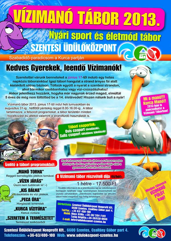 Kedves Gyerekek, leendő Vízimanók! Szeretettel várunk benneteket a június 17-től induló egy hetes napközis táborainkba! Igazi tábori hangulat a strand árnyas fái alatt kialakított sátras bázison. Töltsük együtt a nyarat a szentesi strandon, ahol bármikor csobbanhatsz vagy vízi-csúszdázhatsz! Akkor is jelentkezz hozzánk, hogyha már nagynak érzed magad, elmúltál 5 éves de még nem töltötted be a 14. életévedet! Hiszen nálunk buli a nyár! Vízimanó tábor 2013. június 17-től indul heti turnusokban és augusztus 31-ig , hétfőtől péntekig reggel 8.00-16.00-ig . A tábor tartalmazza a felsorolt programokat, a tábor területén minden foglalkozást és játékot valamint a strandfürdő használatát is. Minden táborozó VÍZIMANÓ PÓLÓT kap!
