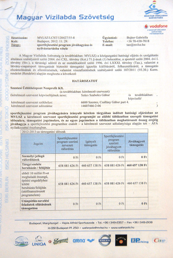 2012. december 4-én az MVLSZ képviseletében Novák Ferenc elnökségi tag, ünnepélyes keretek között adta át Magyar József úrnak a Szentesi VK elnökének és Szirbik Imre polgármesternek az MVLSZ „Tao határozatát”, amely alapján elindulhat az új fedett uszoda építése Szentesen. A pályázat sikerességének záloga volt a szentesi vízilabda sport évtizedeken át tartó kiemelkedő utánpótlás nevelése és a város önkormányzatának anyagiakban is megmutatkozó támogatása.