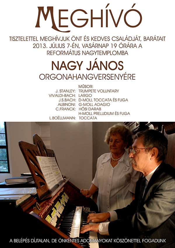 Tisztelettel meghívjuk Önt és kedves családját, barátait 2013. július 7-én, vasárnap 19 órára a Református Nagytemplomba NAGY JÁNOS orgonahangversenyére. A belépés díjtalan, de önkéntes adományokat köszönettel fogadnak.