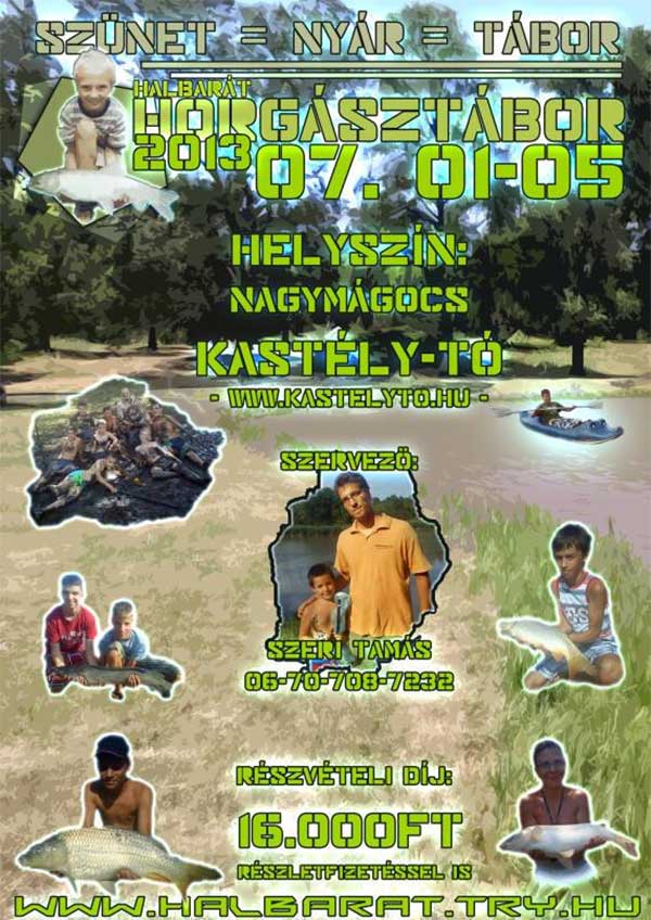 Itt a nyár és nincs iskola ?! Gyere táborba! Megmondom, hogy hova, Ha szeretsz horgászni és unalmas a négy fal, A horgodra biztosan akad majd egy-két szép hal. Vízi olimpia, kenuzás meg úszás, ha szeretnéd, lehet sárban kúszás. Horgászverseny, s ami szíved vágya. Pergetés, pontyozás, a halak rémálma. Számháború a többiekkel, majd sátorban alvás. Bátraknak zseblámpával igazi kihívás. Nagymágocson a Kastély-tónál július 1-5-ig.