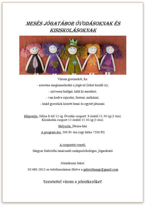 Időpontja: Július 8-tól 12-ig. Óvodás csoport: 9 órától 11.30-ig (3 óra). Kisiskolás csoport 13 órától 15.30-ig (3 óra). Helyszín: Dózsa-ház A program ára: 500 Ft/ óra (egy hétre 7500 Ft) A csoportot vezeti: Magyar Gabriella tanácsadó szakpszichológus, jógaoktató Jelentkezni lehet: 30/480-2812-es telefonszámon illetve a gabriellamgr@gmail.com