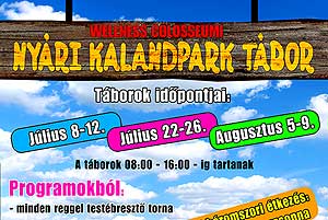 WELLNESS COLOSSEUMI NYÁRI KALANDPARK TÁBOR várja a nyári szünetben a gyermekeket július 8-12, július 22-26 és augusztus 5-9 között. A táborok 08:00 - 16:00 óráig tartanak minden nap. Bővebb információ a plakáton! Katt a képre! Szentes, 2013. 06. 03.