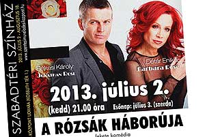 Détár Enikő és Rékasi Károly főszereplésével mutatják be 2013. július 2-án (kedden) 21 órától A rózsák háborúja című fekete komédiát a Szentesi Nyári Szabadtéri Színház keretében. Az előadásra jegyek kaphatók a Művelődési és Ifjúsági Házban (Szentes, Tóth József u. 10-14., Tel.: 63/314-211), a Babilon Könyvesházban (Szentes, Kossuth Lajos u. 11., Tel.: 63/318-673), valamint a helyszínen, az előadás előtt (Szentes, Kossuth tér 1.) Katt a képre! Szentes, 2013. 06. 25.