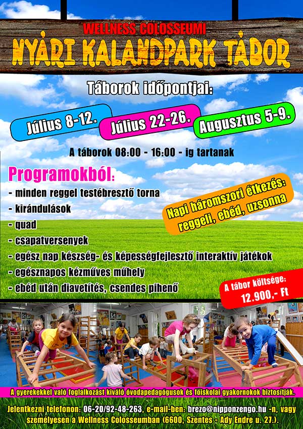 WELLNESS COLOSSEUMI NYÁRI KALANDPARK TÁBOR várja a nyári szünetben a gyermekeket július 8-12, július 22-26 és augusztus 5-9 között. A táborok 08:00 - 16:00 óráig tartanak minden nap. Bővebb információ a plakáton!