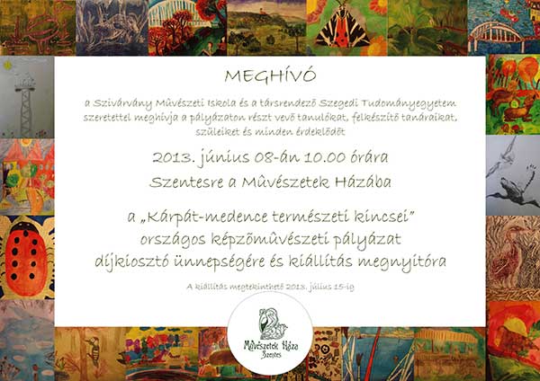 A Szivárvány Művészeti Iskola és a társrendező Szegedi Tudományegyetem szeretettel meghívja a pályázaton résztvevő tanulók és a felkészítő tanáraikat, szüleiket és minden érdeklődőt 2013 június 8-án 10.00 órára Szentesre a Művészetek Házába. Ezen a napon kerülnek átadásra a "Kárpát-medence természeti kincsei" országos képzőművészeti pályázat elismerései. A kiállítás megtekinthető 2013 július 15 ig.