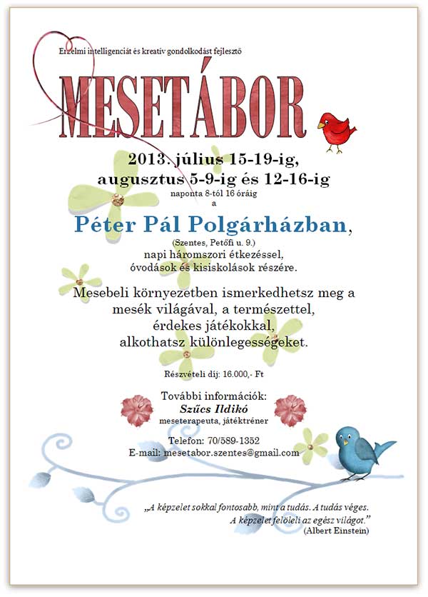 Érzelmi intelligenciát és kreatív gondolkodást fejlesztő MESETÁBOR szerveznek 2013. július 15-19-ig, augusztus 5-9-ig és 12-16-ig naponta 8-tól 16 óráig a Péter Pál Polgárházban, (Szentes, Petőfi u. 9.) napi háromszori étkezéssel, óvodások és kisiskolások részére. Mesebeli környezetben ismerkedhetsz meg a mesék világával, a természettel, érdekes játékokkal, alkothatsz különlegességeket. Részvételi díj: 16.000,- Ft További információk: Szűcs Ildikó meseterapeuta, játéktréner Telefon: 70/589-1352 E-mail: mesetabor.szentes@gmail.com