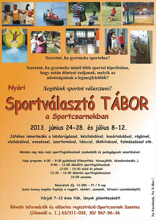 Szeretné, ha gyermeke minél több sportot kipróbálna, hogy aztán dönteni tudjanak, melyik az adottságainak a legmegfelelőbb? Segítünk sportot választani! Nyári Sportválasztó Tábor a Sportcsarnokban 2013. június 24-28. és július 8-12. között. Játékos ismerkedés a labdarúgással, kézilabdával, kosárlabdával, rögbivel, vízilabdával, evezéssel, szertornával, tánccal, ökölvívással, falmászással stb. Minden nap más-más sportfoglalkozások szakedzők és pedagógusok vezetésével.
