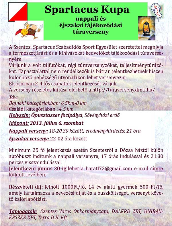 A Szentesi Spartacus Szabadidős Sport Egyesület szeretettel meghívja a természetjárást és a kihívásokat kedvelőket tájékozódási túraversenyére. Várjunk a volt tájfutókat, régi túraversenyzőket, teljesítménytúrázókat. Tapasztalattal nem rendelkezők is bátran jelentkezhetnek hiszen különböző nehézségű útvonalakon lehet versenyezni. Elsősorban 2-4 fős csapatok jelentkezését várjuk.