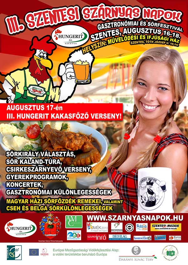 2013. augusztus 16-18. között ismét Szentes lesz a gasztronómia és a sör fővárosa! Ezen a három napos eseményen számtalan program, finomabbnál finomabb ételek, és kiváló házi sörfőzdék remekei várják majd a látogatókat és turistákat. A III. Szentesi Szárnyas Napok az Ifjúsági Ház mellett kerül megrendezésre. A rendezvény minden napja tartogat meglepetéseket, akár ételről, italról, vetélkedőről, vagy sportprogramról is legyen szó. A látogatók megkóstolhatják a finomabbnál finomabb szárnyasokból készült ételeket, és a remek söröket. Ihatunk majd világos, barna, vörös és gyümölcsös sörkülönlegességeket is! Az idei évben ismét lesz Sörkirályválasztás, Csirke szárny evőverseny, Sör Kalandtúra, sőt idén is több mint 100 bográcsban készülnek a finomabbnál finomabb kakaspörköltek a Hungerit Kakasfőző versenyen! Hamarosan bővebb információkkal jelentkezünk!