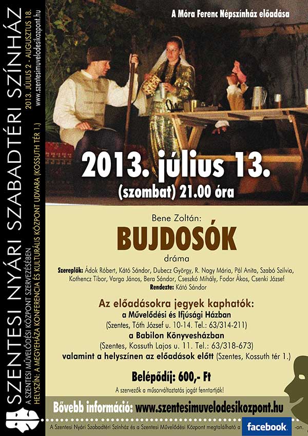 2013. július 13-án 21.00 órakor a Móra Ferenc Népszínház előadásával Bene Zoltán: Bujdosók című drámájával folytatódik a Szentesi Nyári Szabadtéri Színház. Jó hír, hogy aki elfelejtette megvásárolni az előadásra jegyét az még megteheti azt!