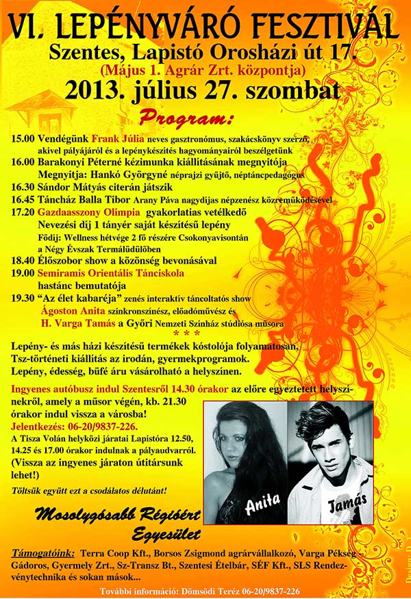 Immár hatodik alkalommal rendezi meg a Mosolygósabb Régióért Egyesület július 27-én a Lepényváró Fesztivált Lapistón. A program hagyományos helyszínen, a Május 1. Agrár Zrt. irodája környékén és a kis falu kultúrházában 15 órakor kezdődik. Szentesről külön autóbuszjárat 14.30 órakor indul, amely a rendezvény végén, kb. 21.30 órakor érkezik vissza. Előzetesen a 06-20/9837-226-os telefonon lehet rá jelentkezni.