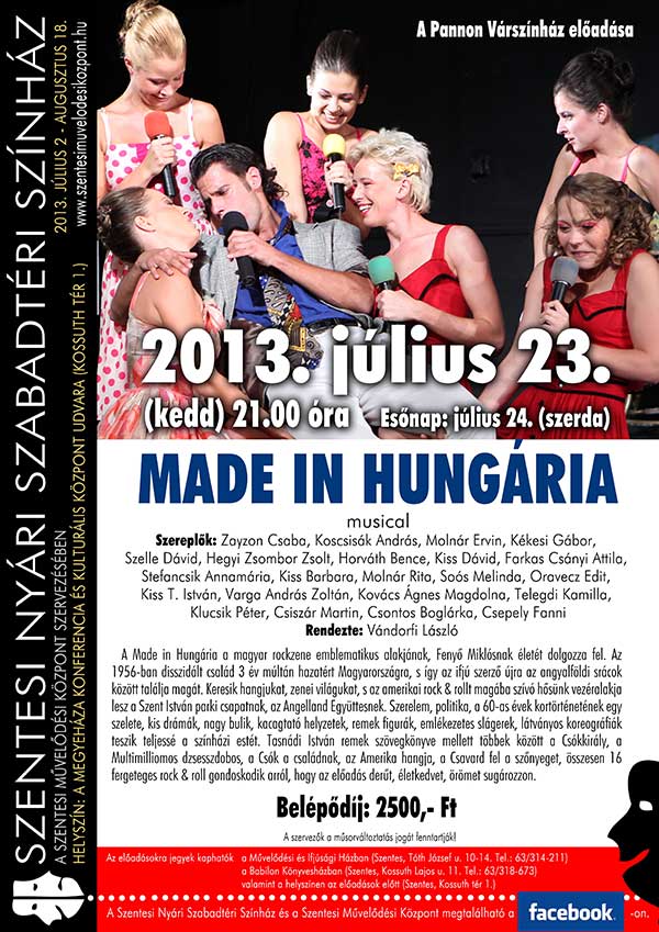 A Made In Hungaria című musicalt láthatja a közönség július 23-án, kedden (esőnap: július 24.) 21 órakor a Pannon Várszínház előadásában a Megyeháza KKK udvarán. A musical a magyar rockzene emblematikus alakja, Fenyő Miklós életét dolgozza fel. Az 1956-ban disszidált család 3 év múltán tért haza Magyarországra, s így az ifjú szerző ismét az angyalföldi srácok között találja magát. Keresik hangjukat, zenei világukat, s az amerikai rock & rollt magába szívó hős vezéralakja lesz az Angelland Együttesnek. 16 fergeteges rock & roll sláger gondoskodik arról, hogy az előadás derűt, életkedvet, örömet sugározzon.