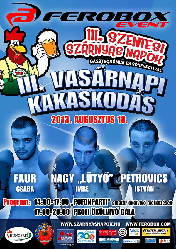 Utóbbit eddig mindkétszer Kánvási József nyerte, és az „uralkodótól" megtudtuk: szeretné megőrizni trónját, megcsinálni a mesterhármast. A III. Szárnyas Napokat augusztus 16-ától 18-áig rendezik, és az is kiderült, a népszerű Hungerit kakasfőző versenyre már eddig többen jelentkeznek, mint az elmúlt évben. Tóthné Kecskés Mária a Hungerit Zrt. képviseletében belkereskedelmi és marketingigazgatója (mely cég az önkormányzat és az Agrár Marketing Centrum mellett a „névadó" főszponzor) elmondta, hogy az esemény az üzem dolgozóinak és családjaiknak is kellemes kikapcsolódást nyújt és egyre sikeresebb. A horgászok két viadalon is kipróbálhatják magukat: az egyiket a Gerecz-tavon (harcsafogó), a másikat a Kurcán (finomszerelékes) tartják, tavaly közel 200-an indultak, idén többre számítanak - tudtuk meg Kiss Csabától. A gyerekeknek is gazdag lesz a kínálat, az állatsimogatótól az interaktív műsoron át az ügyességi versenyekig. De a kutyák (kennelshow, bemutatók) is állandó szereplői a rendezvénynek, amelyen az első két napot koncert, a harmadikat Ferobox Event ökölvívógála zárja. Utóbbin elképzelhető, hogy jelen lesz profi világbajnok ökölvívónk, Erdei Zsolt – hiszen ő is Madár.