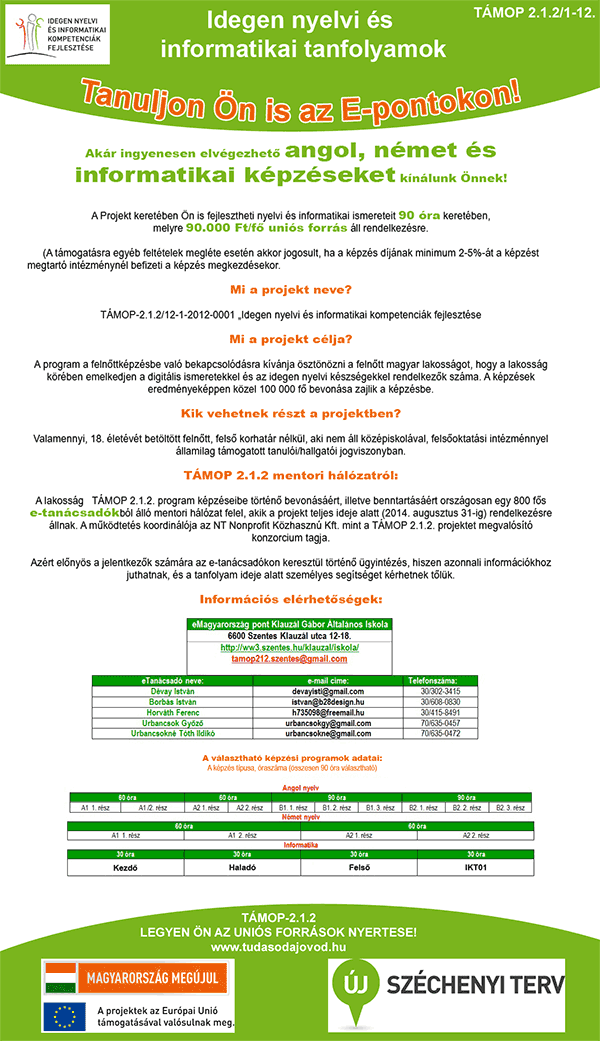 A Támop 2.1.2 pályázat keretében újabb Szentesen induló tanfolyamok jelentek meg. Angol és informatika tanfolyamok indulnak a közeljövőben. A program honlapja a www.tudasodajovod.hu. Regisztrálni és jelentkezni a https://eper.hu/eperhir/kepzett/kepzettbejelentkezes.aspx oldalon lehet. Amennyiben szeretné, hogy később is induljanak nyelvi és informatikai képzések a program keretében jelezze előzetes igényét a Klauzál Iskola E-pontjának honlapján: http://ww3.szentes.hu/klauzal/iskola/tamop-2-1-2/tamop-2-1-2 !