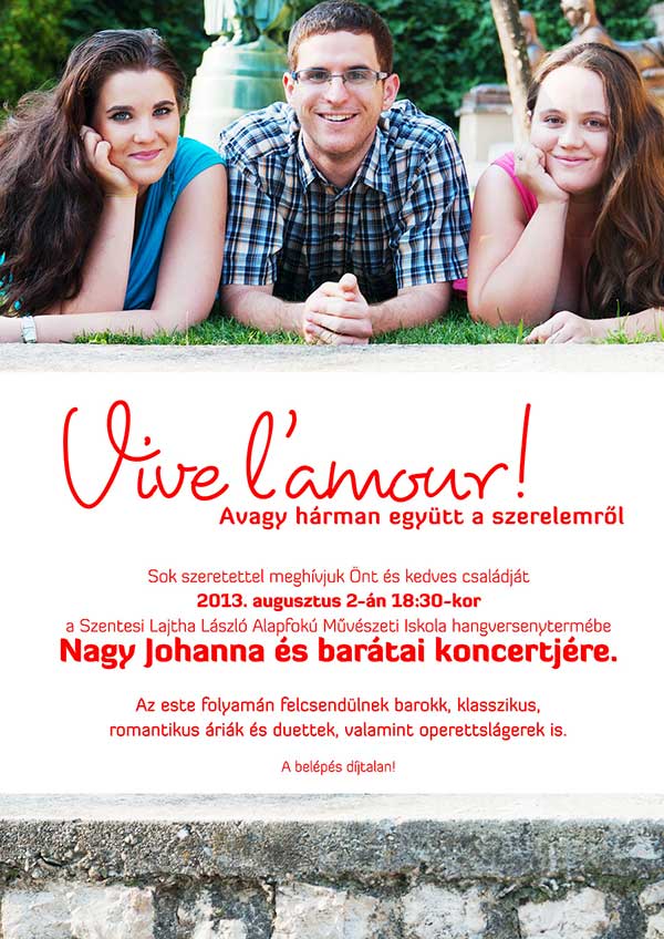 Vive l'amour! - Avagy hárman együtt a szerelemről címmel hallhatjuk 2013. augusztus 2-án, 18.30 órakor Nagy Johanna és barátainak koncertjét a Szentesi Lajtha László Alapfokú Művészeti Iskola hangversenytermében. Az est folyamán felcsendülnek barokk, klasszikus, romantikus áriák és duettek, valamint operett slágerek is. A belépés díjtalan!