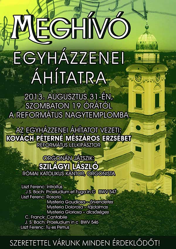 Meghívjuk Önt és kedves családját 2013. augusztus 31-én, szombaton 19 órától a Református Nagytemplomban tartandó egyházzenei áhítatra. Az áhitatot vezeti: Kovách Péterné Mészáros Erzsébet református lelkipásztor. Orgonán játszik: Szilágyi László római katolikus kántor, orgonista.