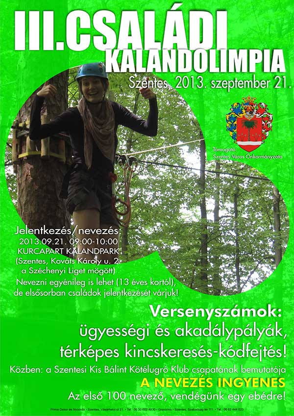2013. szeptember 21-én rendezik meg Szentesen immáron harmadik éve a Családi Kalandolimpiát. A rendezvény új helyszínre költözik, így a hamarosan megnyíló Kurca-part Kalandpark már megépült kötélpályáján mindenki kipróbálhatja magát. A versenyre nevezni szeptember 21-én 9.00-10.00 óráig lehet a helyszínen. Az első 100 versenyzőt vendégül látják egy ebédre a szervezők! A versenyszámokról és a programról az alábbi plakátról tájékozódhat!