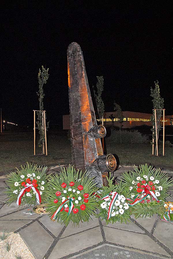 Az emlékmű ismertetőjében hallhattuk, hogy a lengyel származású szegedi szobrászművész, Brzózka Marek egy négy méter magas, szárnyat formáló emlékműve egy ejtőernyő mintázatára épített talapzaton nyugszik, rajta a két elhunyt pilóta nevével. Plexiüveg alatt a gép roncsából egy megmaradt alkatrészt is elhelyeztek a szobor tövében, így a kilátogatók az eredeti repülő egy piciny darabjával is találkozhatnak.