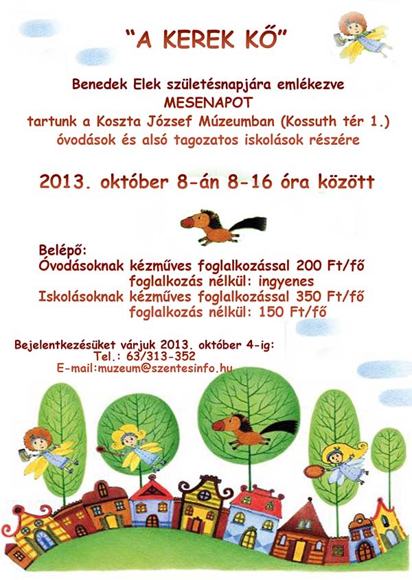 Benedek Elek születésnapjára emlékezve MESENAPOT tartanak a Koszta József Múzeumban óvodás és alsó tagozatos iskolások részére 2013. október 8-án 8-16 óra között.
