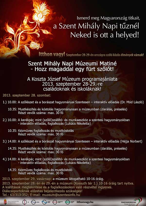 A Koszta József Múzeum Szent Mihály Napja alkalmából rendezett múzeumi matinéja Téged is vár! (részletek a plakáton). Ezen kívül lesz Szent Mihály Napi tűzgyújtás is, melynek részleteiről hamarosan beszámolunk!