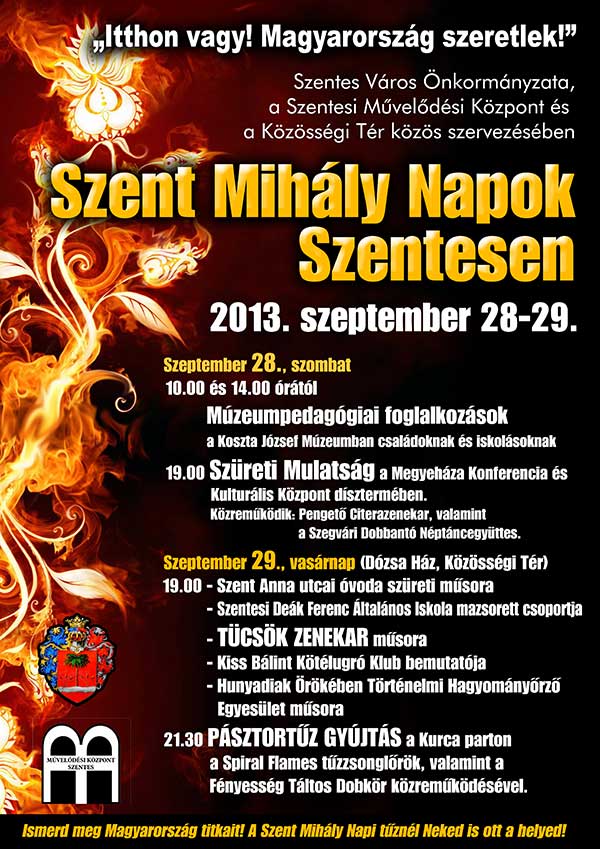 Magyar Televízió Zrt. országos akciót indított Itthon vagy – Magyarország, szeretlek! szlogennel. A kezdeményezés célja, hogy szeptember utolsó hétvégéjén, Szent Mihály napján a közmédia segítségével két napos, tematikus műsorfolyam keretében megmutassák, milyen szép az országunk, mennyi értéket őriz és milyen csodálatos emberek lakják. A műsorfolyam végén, a hétvége zárásaként, vasárnap este fellobban egy hatalmas pásztortűz sok-sok település saját pásztortüzével együtt, az összetartozás szimbólumaként. E nemes kezdeményezéshez csatlakozott Szentes városa is. Bízunk abban, hogy a pályázatban szereplő körkapcsolás egyik helyszíne lehet városunk. Több helyszínen számos szórakozási lehetőség várja az érdeklődőket ezen a hétvégén. Lássuk a programot, tehát: