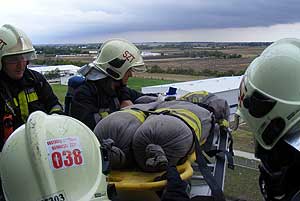 Az épületen belül szűk út vezet az alsó szintre, ezért az épület mellett felállított gépezetes tolólétra segítségével juttatták le a sérültet jelképező bábut az egység tagjai. Az állománynak a beavatkozás során gondoskodnia kellett még a balesetet okozó vegyszer által érintett szakfelszerelések mentesítéséről is. A gyakorlat jó alkalmat nyújtott az állomány részére, hogy gyakorolhassák a vegyi anyagok környezetében történő műszaki mentési feladatokat, melyet nehezített a magasból történő személymentés is. A gyakorlatot a tűzoltó-parancsnokság vezetése mellett ellenőrizte Kalmár Károly tű. alezredes, a Szentesi Katasztrófavédelmi Kirendeltség tűzoltósági felügyelője is.