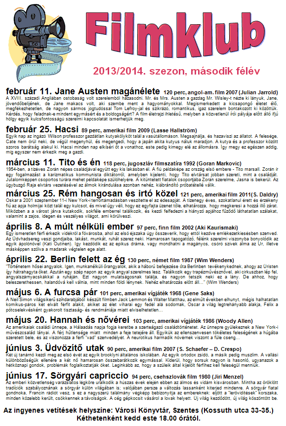 Filmklub a Könyvtárban (második félév programja) A filmrajongók figyelmébe ajánljuk a Városi Filmklub 2013/2014 szezonjának második félévének programját. Az ingyenes vetítések kéthetenként kedden a Szentesi Városi Könyvtárban (Kossuth utca 33-35.) 18.00 órai kezdettel kerülnek megrendezésre.
