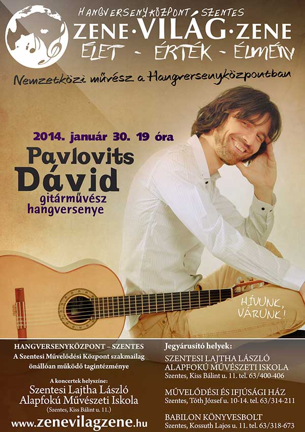 A kézváltás komoly feladatok elé állította, de a hit, a kitartás, az új ujjgyakorlatok kifejlesztése és a napi 4-5 óra gyakorlás meghozta az eredményét. Pavlovits Dávid koncertjén ízelítőt kaphatunk széles repertoárjából, mely Bachtól saját műveiig számos kort és stílust érint, nem nélkülözve az improvizációt sem 2014. január 30-án, csütörtökön este 7 órakor a szentesi Hangversenyközpontban.