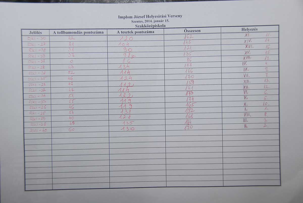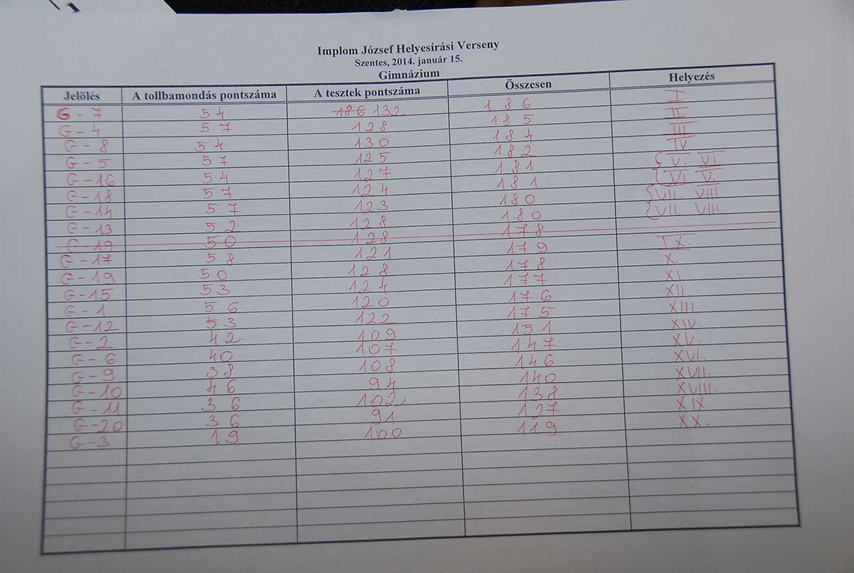 Először tollbamondást írtak, majd feladatlapon mérték össze tudásukat a versenyzők. Eredmények