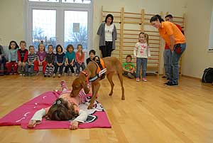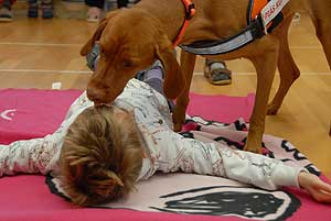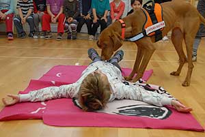 El sem tudjuk képzelni, hogy mennyi játékba lehet a kutyát bevonni! Ha kell ugat, fekszik, szimatol. A legizgalmasabb feladat az volt, amikor a fekvő gyermeken egy jutalomfalatot rejtettek el és Zsófi megkereste azt. Volt, hogy a gyermek homlokáról vette el fogheggyel a finom falatot úgy, hogy azt a gyerkőc meg sem érezte.