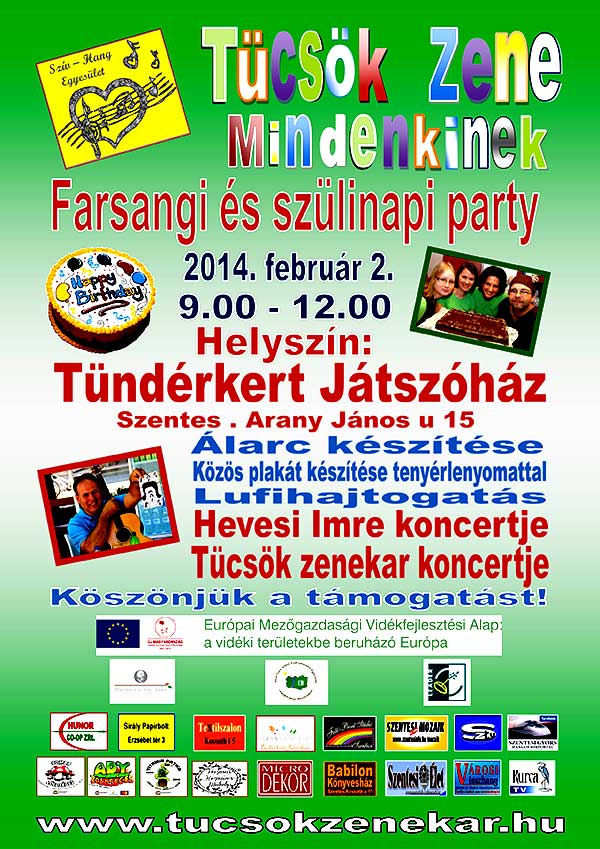 A Tücsök Zenekar, valamint a SZÍV-HANG Kulturális és Egészségnevelő Egyesület szeretettel meghív mindenkit a Farsangi és Tücsök Klub 3. Szülinapi Bulira! A rendezvény időpontja: 2014. február 2. /vasárnap/ 9 óra Helyszíne: Szentes, Tündérkert Játszóház (Arany János u 15)