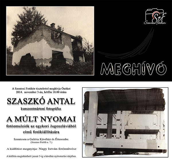 A Szentesi Fotókör tisztelettel meghívja Önt 2014. november 3-án, hétfőn 18.00 órára SZASZKÓ ANTAL kunszentmártoni fotográfus A MÚLT NYOMAI fotóemulziók az egykori Jugoszláviából című fotókiállítására Szentesen a Galéria Kávéház és Étterembe. (Szentes Petőfi u. 7.) A kiállítást megnyitja: Nagy István fotóművész.