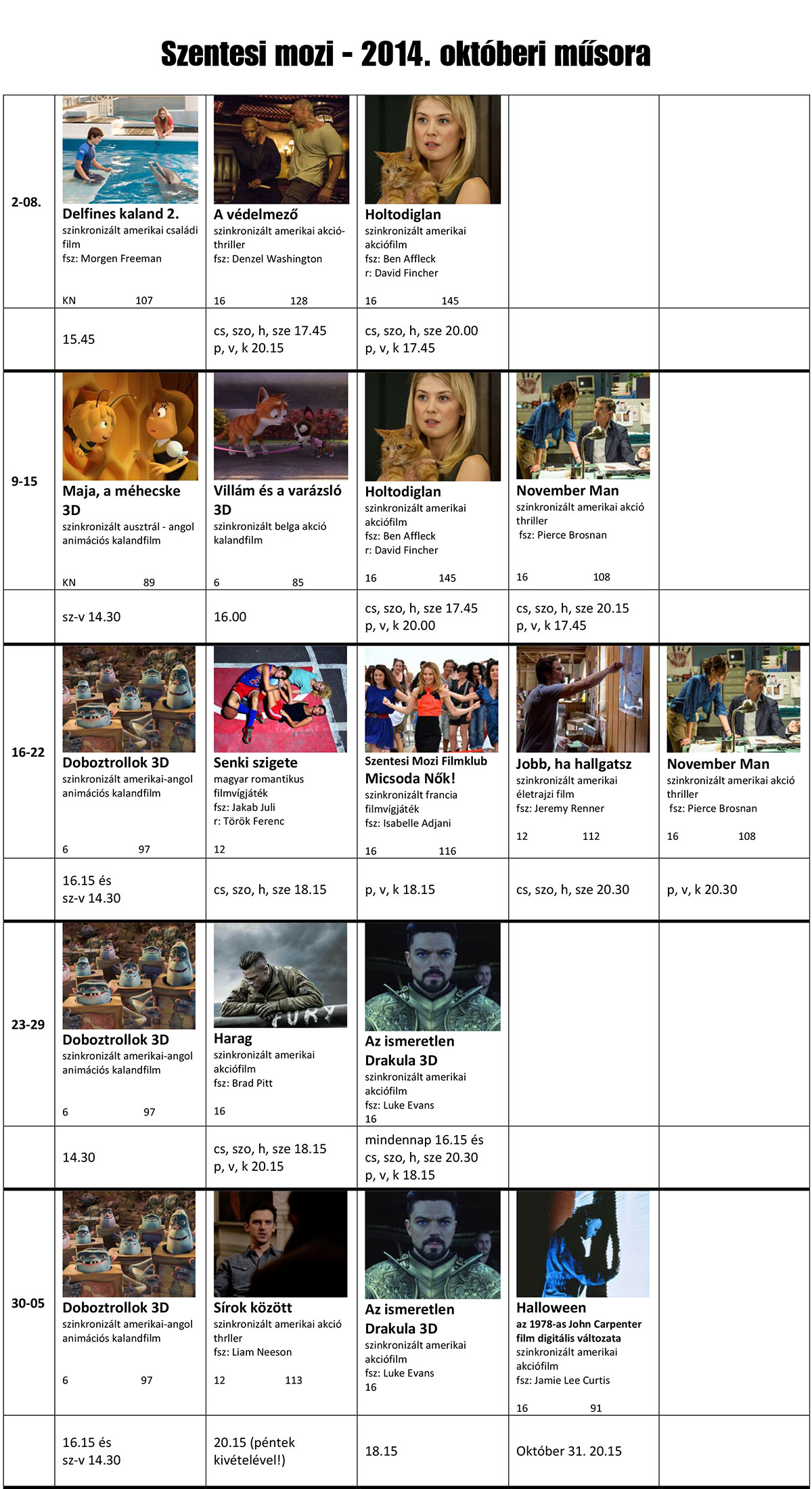 A nézői igényekre való tekintettel műsorunk az alábbiak szerint módosul: Október 17. péntek 20:30 November Man helyett Kamuzsaruk (16) Október 18. szombat 18:15 Senki szigete helyett Lucy (16) Október 19. vasárnap 20:30 November Man helyett Holtodiglan (16) Október 21. kedd 20:30 November Man helyett A Védelmező (18) A jegyár erre a 4 előadásra csak 790 Ft!!!