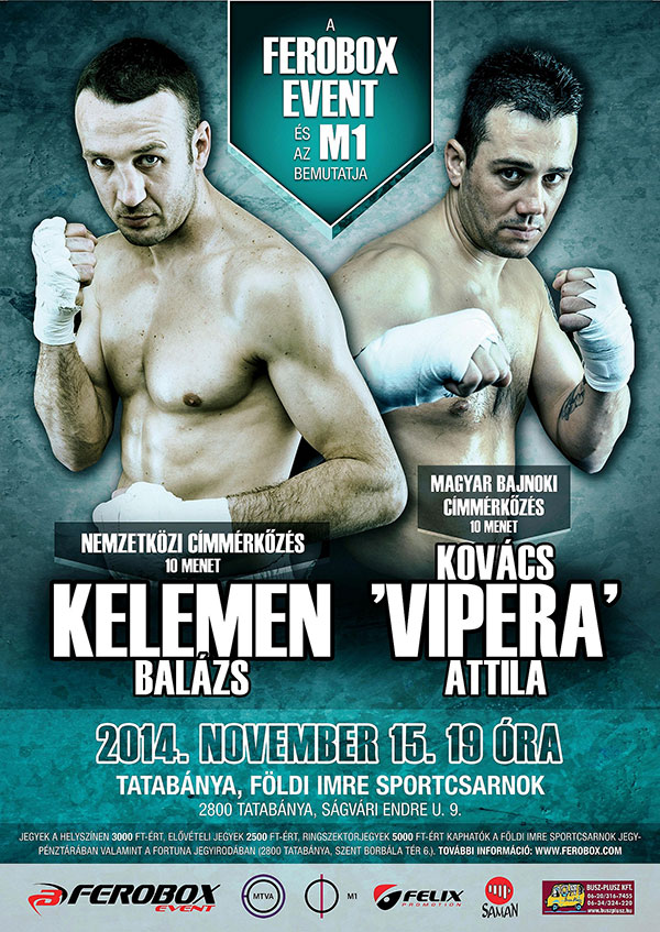A szentesi székhelyű Ferobox Event profi boksz istálló újabb nagyszabású gálát szervez, ez úttal Tatabányán. Kovács „Vipera” Attila sajnos kiesett a programból egy vállsérülés miatt. A szervezők viszont bíznak benne, hogy, hogy az év végi, december 06-i gálán már ringbe tud lépni.