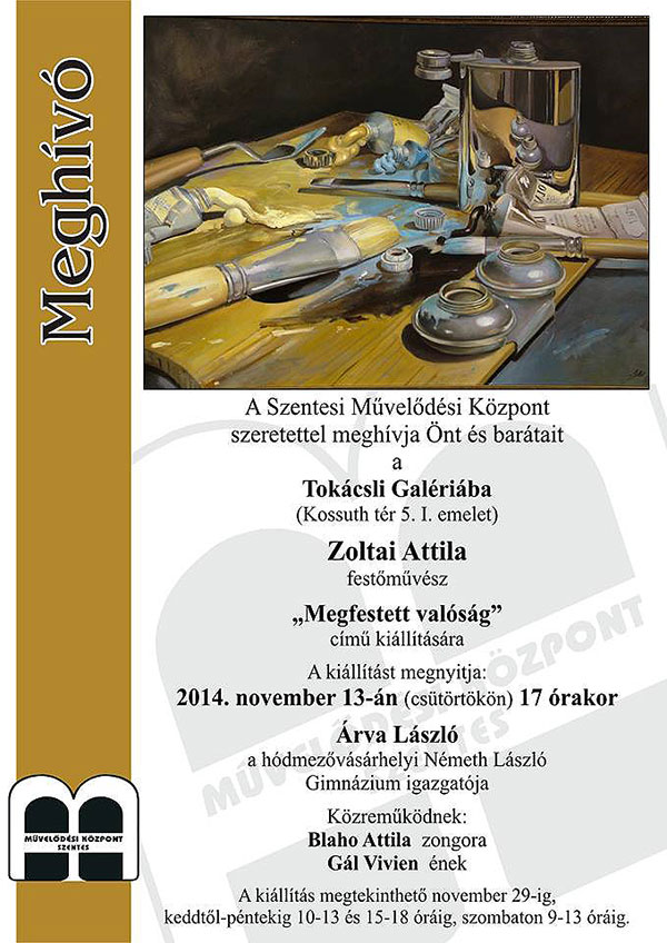 2014. november 13-án délután 5 órakor nyílik meg "Megfestett valóság" címmel Zoltai Attila festőművész kiállítása a Tokácsli Galériában. Minden érdeklődőt szeretettel várnak!