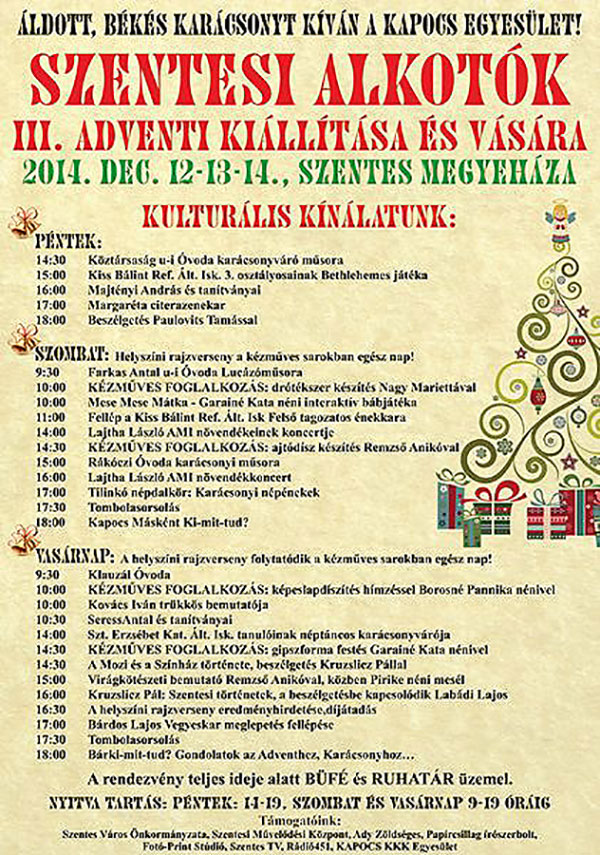 Szentesi Alkotók Harmadik alkalommal rendezi meg a szentesi alkotók adventi kiállítással egybekötött vásárát a Kapocs Kistérségi Kulturális Közhasznú Egyesület. Jövő hét péntek reggeltől vasárnap estig a helyi alkotók munkái töltik meg a Megyeháza konferencia központjának mindhárom emeleti termét. A helyszín évről évre bővül de a kiállítók száma is jóval meghaladja az első adventi vásárét. A hímzőktől a lekvárkészítőn át a keramikusig szinte teljes számban a városból – lesznek jelen és mutatják be portékáikat a látogatóknak. Az adventi kiállításon és vásáron a szentesieknek lehetőségük lesz igazi, helyben készült ajándékokat beszerezni a családnak, de folyamatosan kísérőprogramok is zajlanak minden korosztály számára a három napon.